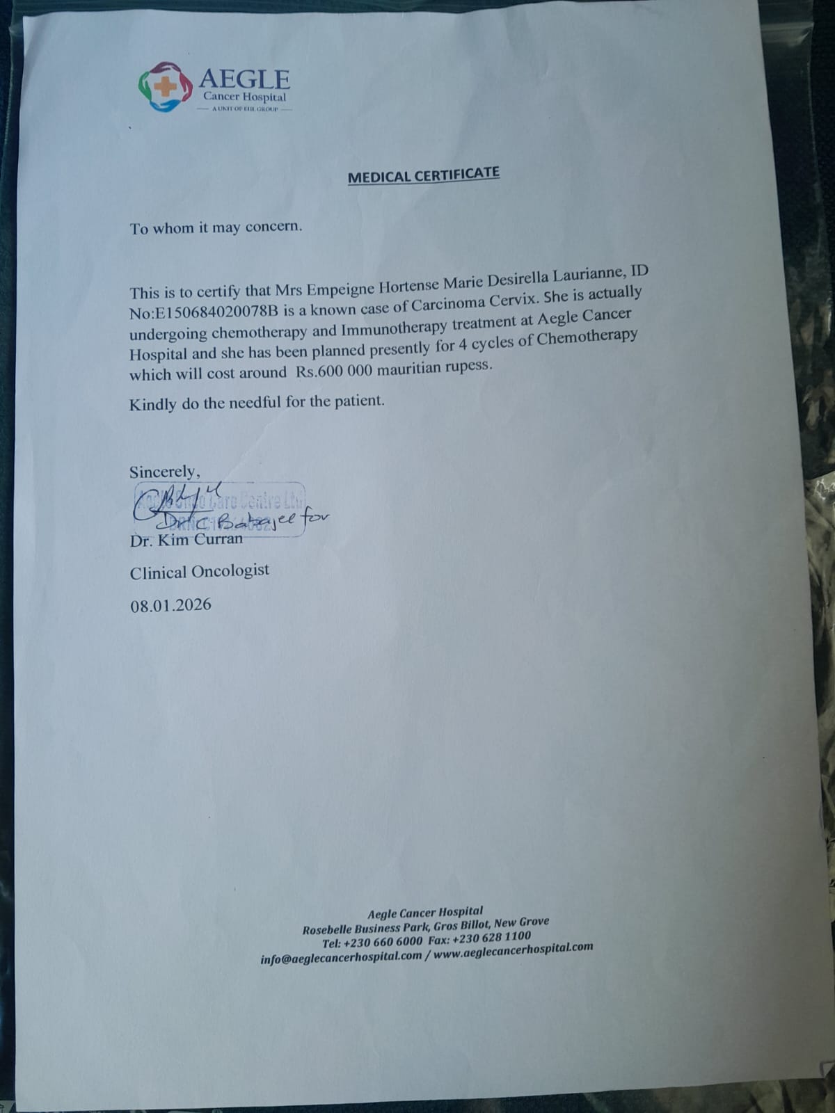 Elle est suivie à Aegle Cancer Hospital.