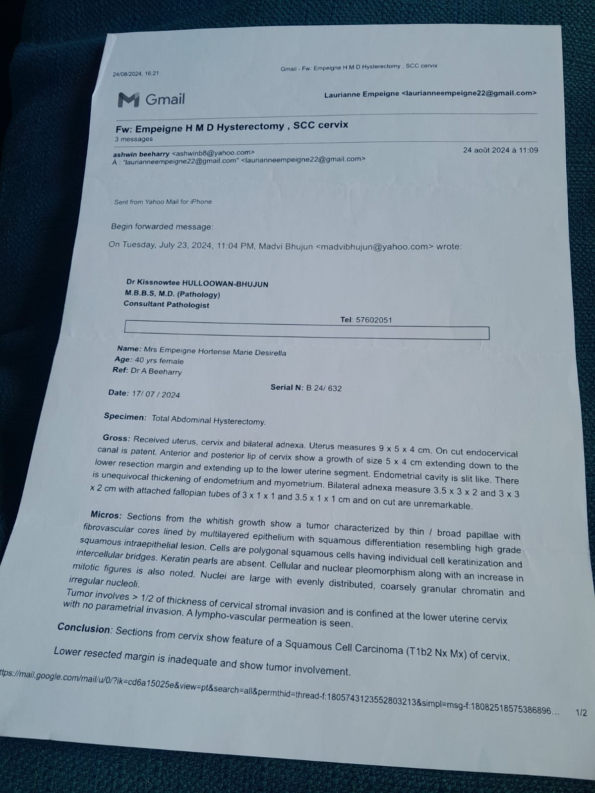 Despite undergoing major surgery (hysterectomy), the cancer has progressed and requires urgent chemotherapy and immunotherapy.