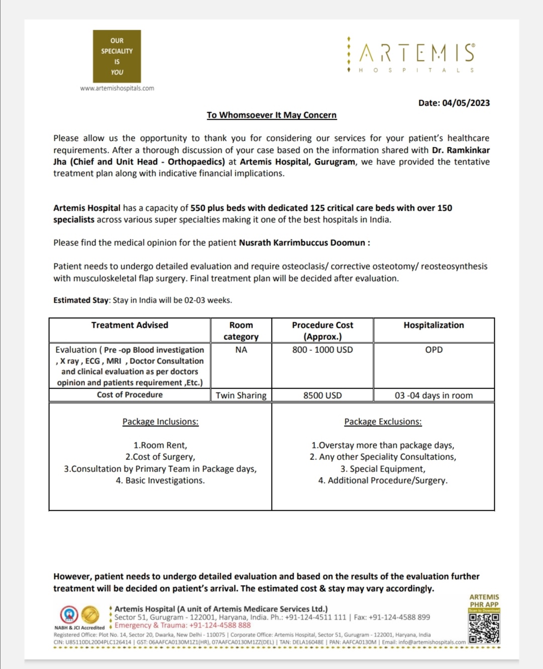 Then, since my leg is quite a complex case, and gaining several opinions from many ortho surgeons and consultants i decided with the support of doctors from both Jeetoo Hospital and Darne clinic to fly for India for further surgeries. I went to India 3 times, and underwent many surgeries.
