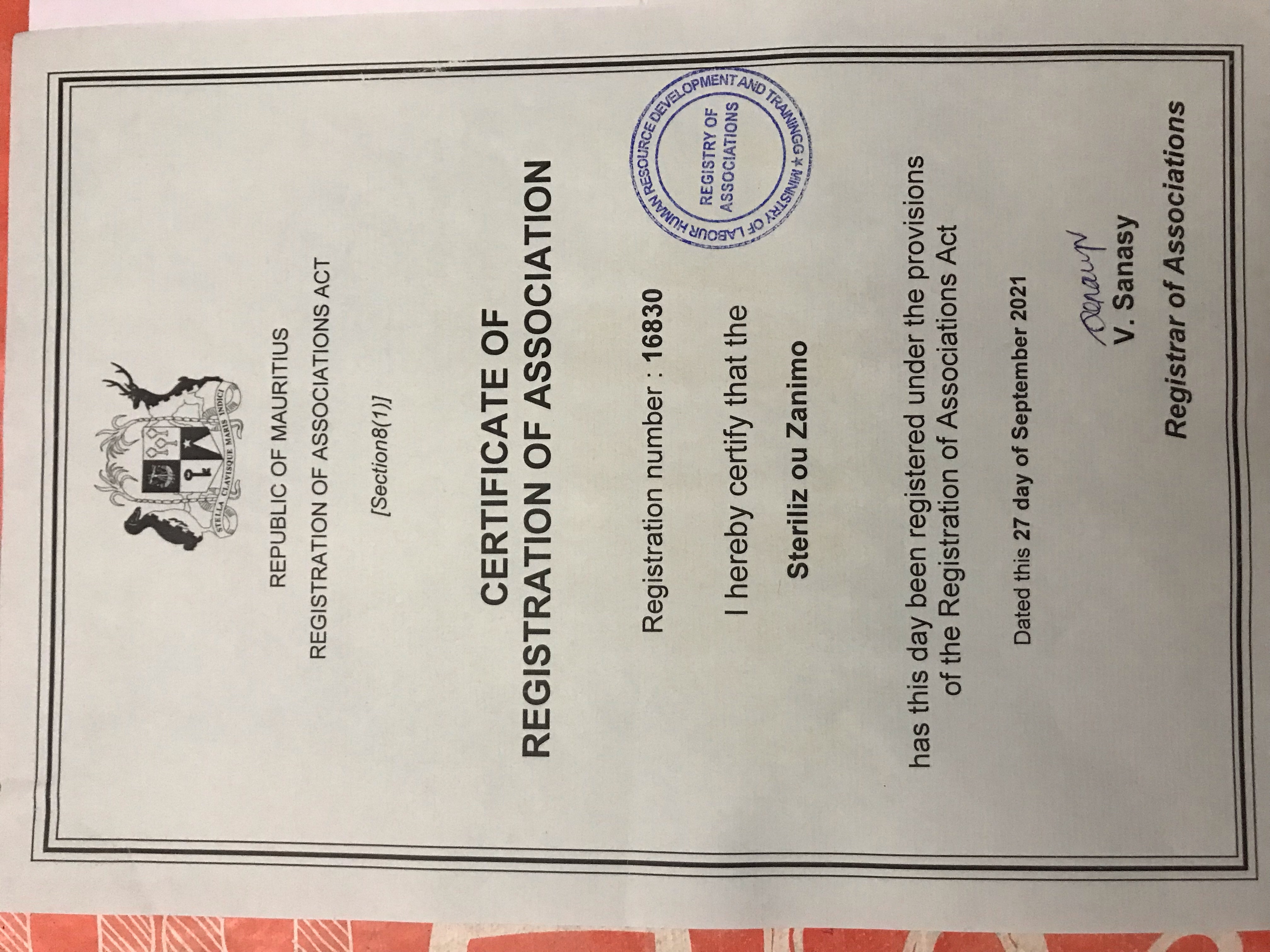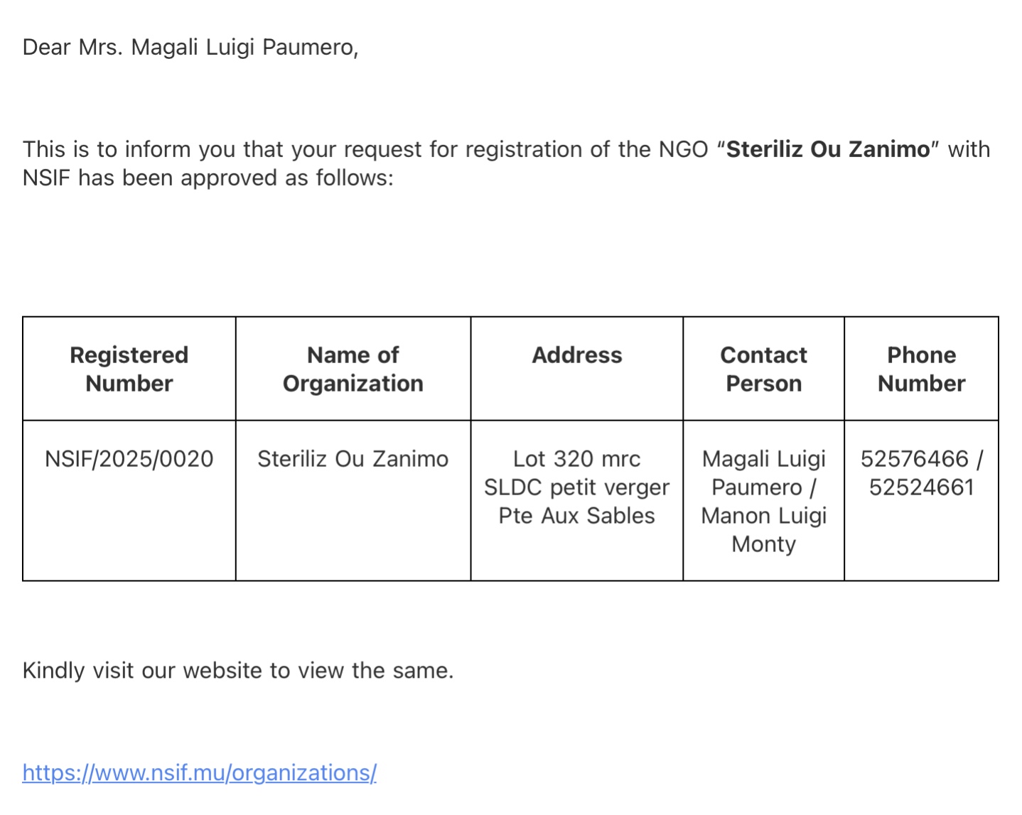 Steriliz Ou Zanimo is a registered Mauritian NGO (Registration No. 16830, active since 2021) dedicated to tackling animal overpopulation in a humane, ethical and sustainable way: sterilization. We are officially registered with the NSIF to receive CSRs.